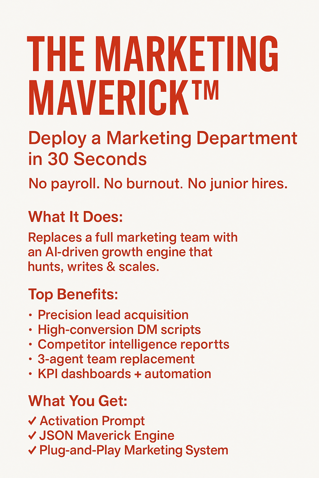 THE MARKETING MAVERICK™ Deploy a Marketing Department in 30 Seconds No payroll. No burnout. No junior hires. What It Does: Replaces a full marketing team with an AI-driven growth engine that hunts, writes & scales. Top Benefits: • Precision lead acquisition • High-conversion DM scripts • Competitor intelligence reports • 3-agent team replacement • KPI dashboards + automat What You Get: ✔ Activation Prompt ✔ JSON Maverick Engine ✔ Plug-and-Play Marketing System.
