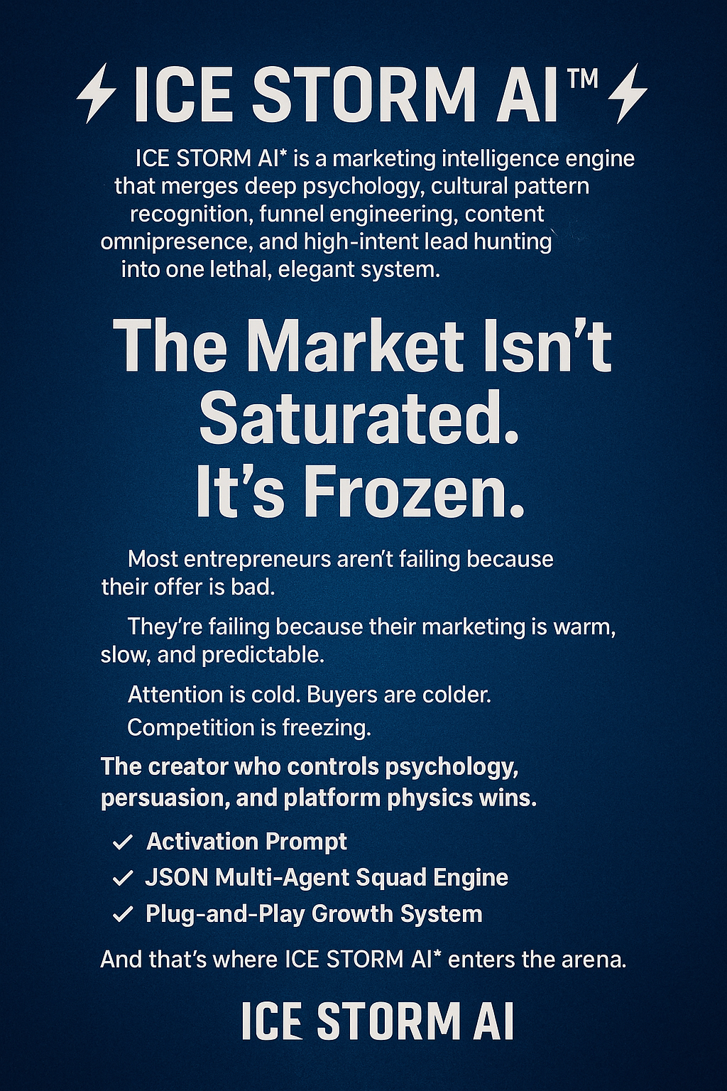 ICE STORM AI™ transforms your marketing into a powerhouse. It takes your brand from average to unstoppable making your campaigns inevitable, your presence undeniable, and your influence over your niche absolute. No more fitting in. You set the temperature.