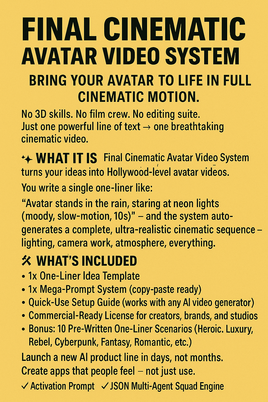 Final Cinematic Avatar Video System Agent AI™ Create Ultra-Realistic, Story-Driven Avatar Videos That Convert on Every Platform.